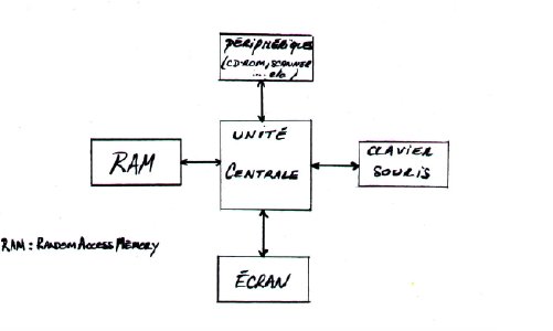Comme on peut le voir, tout tourne en fait autour de l'unité centrale. Cette dernière contient le processeur (le 'coeur' de la machine), le bus